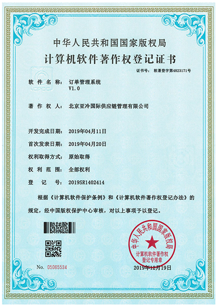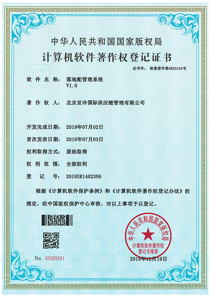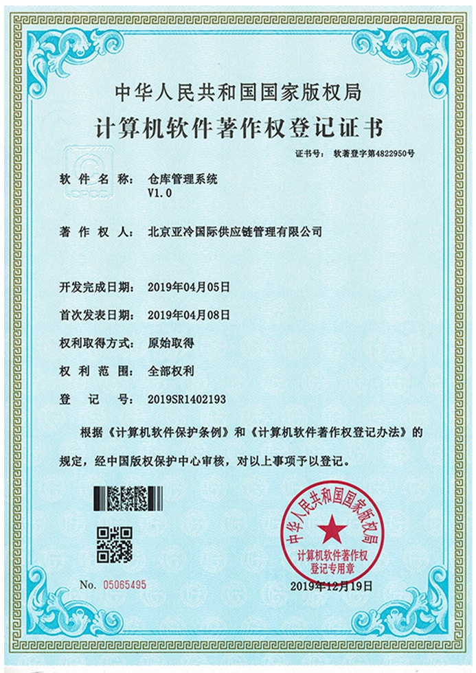 冷鏈客戶管理體系統(tǒng)軟件著作權(quán)登記證書