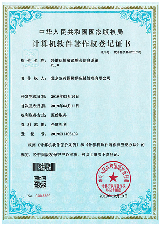 冷鏈運(yùn)輸資源整合信息系統(tǒng)軟件著作權(quán)登記證書