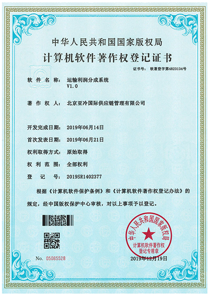 運(yùn)輸利潤(rùn)分成系統(tǒng)軟件著作權(quán)登記證書