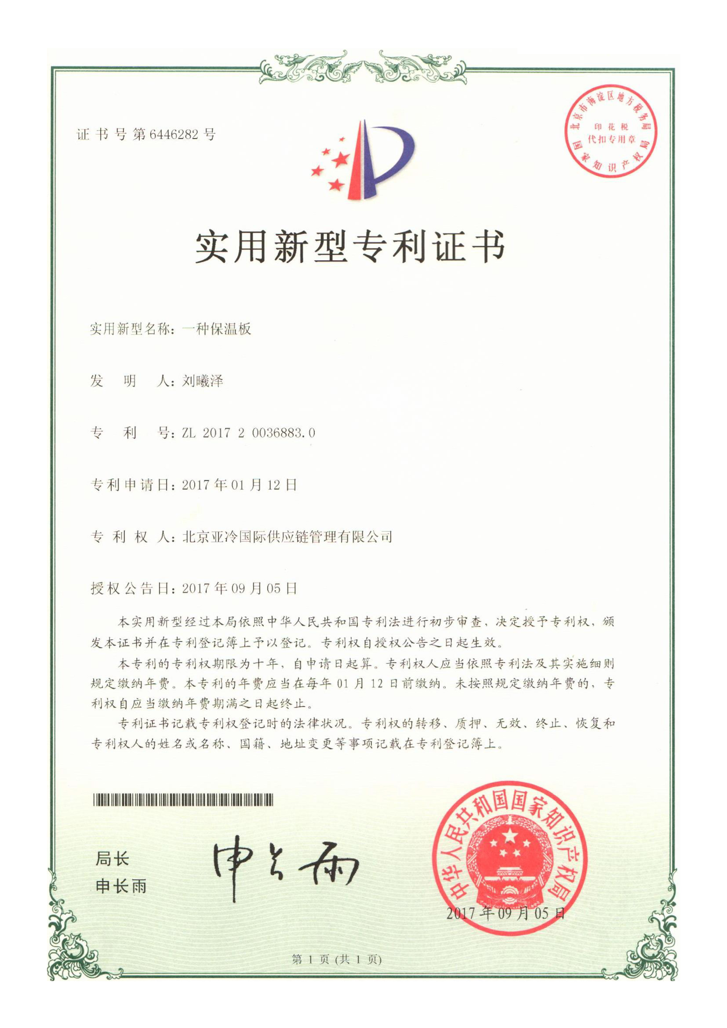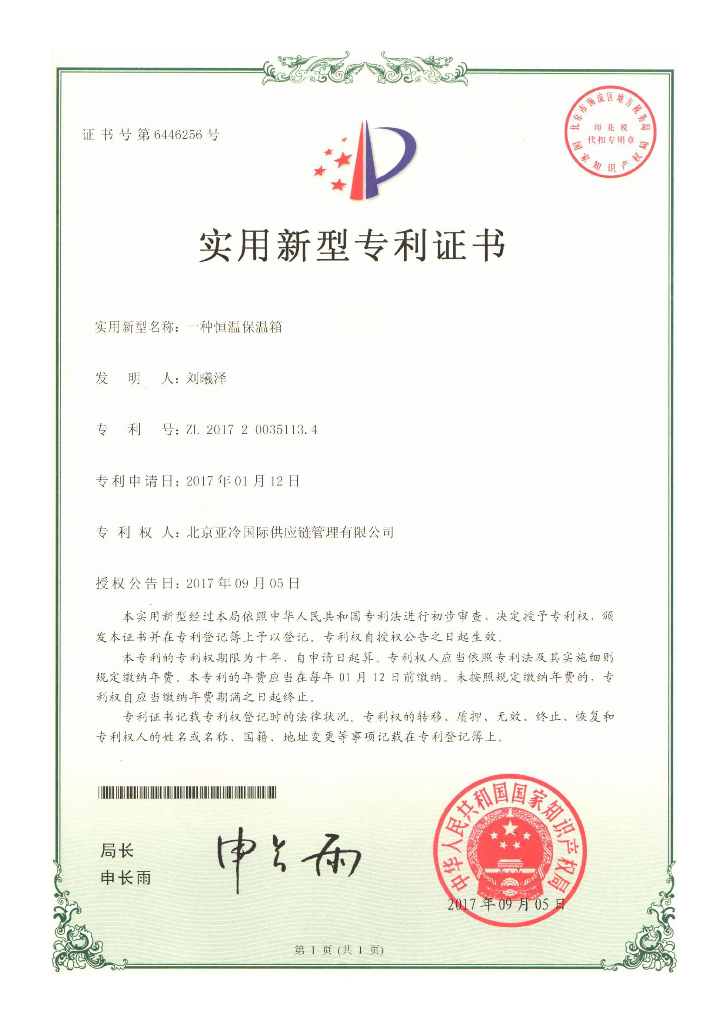實(shí)用新型專利證書 冷鏈物流運(yùn)輸設(shè)備