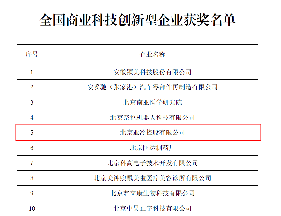 亞冷榮獲“2021年全國商業科技創新型企業”